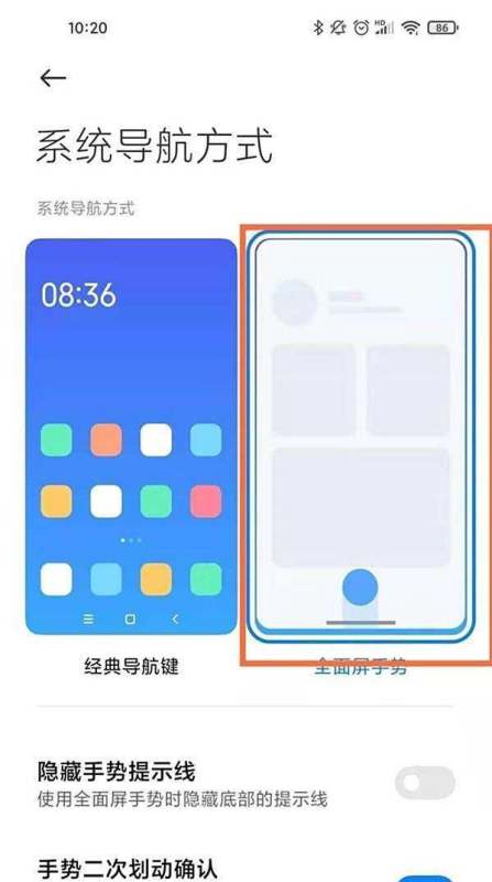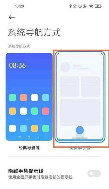 调整手势提示线显示在导航方式列表中选择【全面屏手势】,此时页面会显示【隐藏手势提示线】选项。