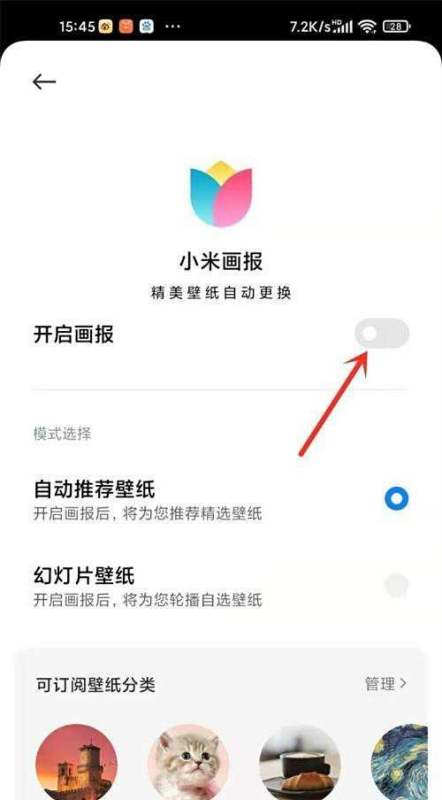 关闭【开启画报】右侧开关按钮:在锁屏画报页面中,找到“开启画报”选项,点击其右侧的开关按钮,将其关闭。如果希望继续使用锁屏画报功能,但不想让壁纸自动轮播,可以跳过此步,直接进行下一步操作。