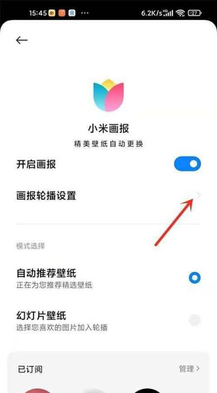 点击【画报轮播设置】选项:在锁屏画报页面中,找到“画报轮播设置”选项,点击进入。