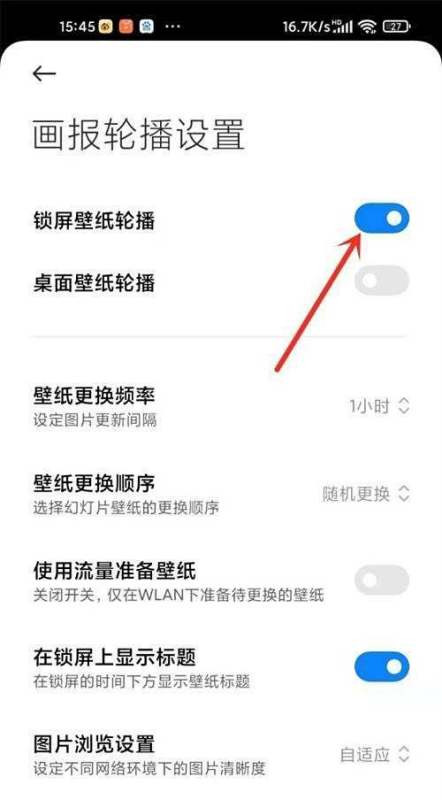 关闭【锁屏壁纸轮播】右侧开关按钮:在画报轮播设置页面中,找到“锁屏壁纸轮播”选项,点击其右侧的开关按钮,将其关闭。关闭后,锁屏壁纸将不再自动轮播,可以手动设置并保持固定的锁屏壁纸。