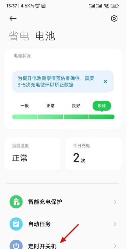 找到定时开关机选项:在电池管理页面中,滑动查找并点击“定时开关机”选项。