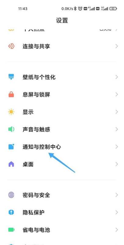 进入设置页打开手机桌面【设置】图标,在设置列表中找到并点击【通知与控制中心】选项。