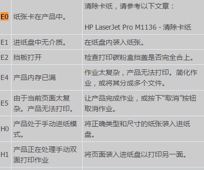 惠普M1136打印机E0是因为打印机卡纸了,将卡的纸取出来就可以了。