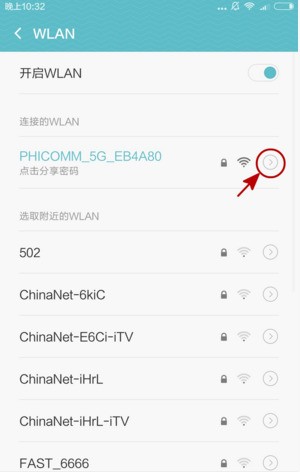 3、在WIFI选择界面,点击已经连接的WIFI右边的圆圈(有小三角)。