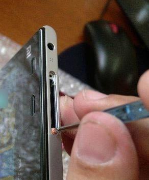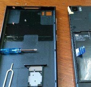 取出卡槽后,我们使用螺丝刀,小米3顶部卡槽位置有两颗固定后盖螺丝,我们将螺丝拆卸下来即可,如下图所示: