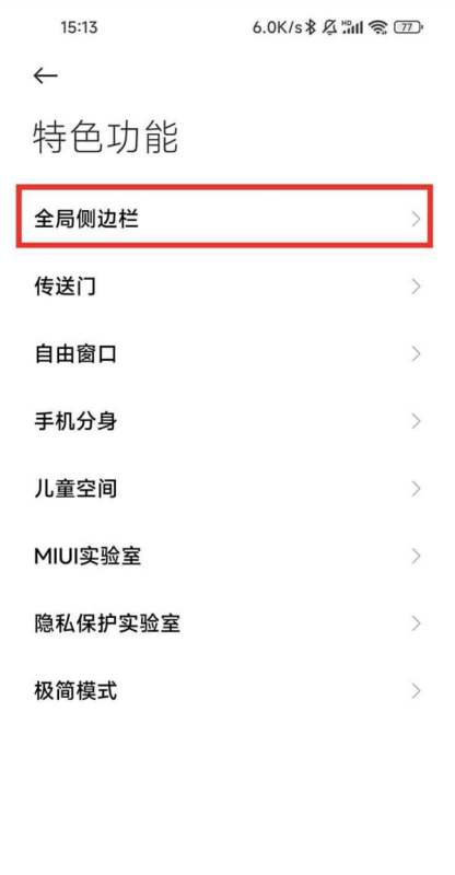 选择“全局侧边栏”:在特色功能页面中,找到并点击“全局侧边栏”选项。