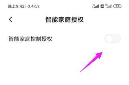 点击【智能家庭控制授权】右侧的开关按钮,将其从开启状态切换为关闭状态(通常显示为灰色或“关闭”字样)。此时系统会提示确认操作,点击确认即可完成关闭。