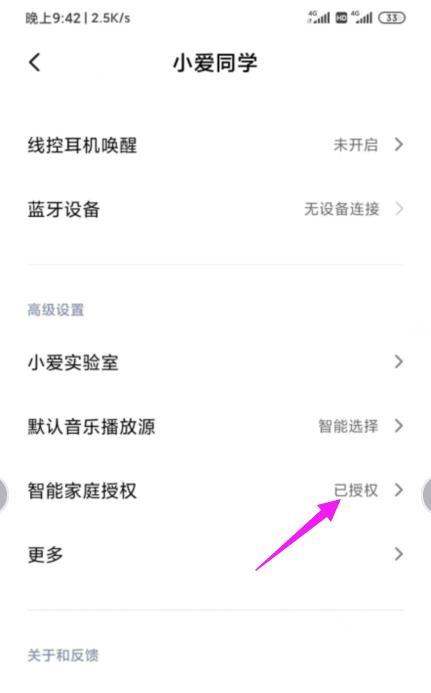 在【小爱同学】设置页面中,继续向下滚动,找到并点击【智能家庭授权】选项。此选项用于管理与智能家居设备的连接权限。