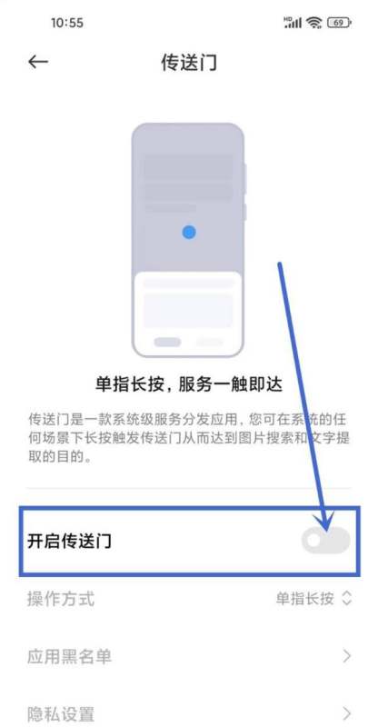 关闭开启传送门功能开关:在传送门设置页面中,找到“开启传送门”功能开关,将其滑动至关闭状态。此时,长按屏幕识别功能即被关闭。