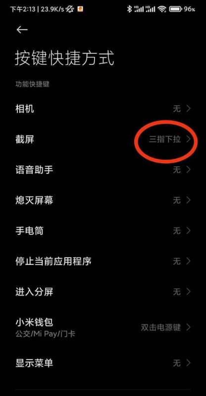 选择三指下拉截图:在“按键快捷方式”页面中,找到“截图”选项,并点击其右边的“三指下拉”选项,进入三指下拉截图设置页面。