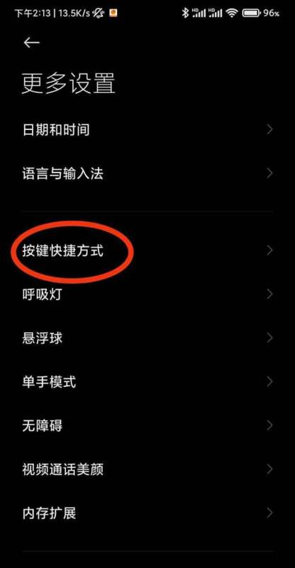 进入按键快捷方式:在“更多设置”页面中,继续向下滑动,找到并点击“按键快捷方式”选项。