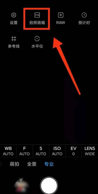 进入画幅设置菜单:在专业模式界面中,点击右上角或左上角的设置展开标志(通常为齿轮或三点图标),展开更多设置选项。