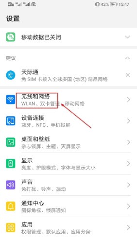 二、在设置界面中,找到并点击【无线和网络】按钮。