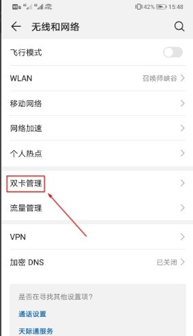 三、在无线和网络设置界面中,下滑界面,找到【双卡管理】,点击进入操作界面。