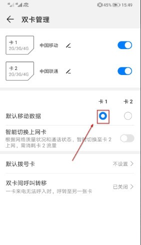四、进入双卡管理界面后,能够看见系统默认的为优先使用卡1的流量。