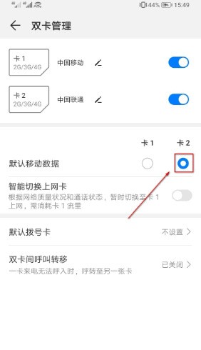 五、在默认移动数据后面,在卡2下方的原点勾选上。此时再使用网络即使用的为卡2的流量。