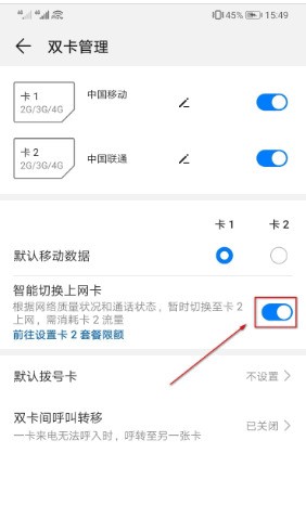 六、当然,在默认移动数据下方还有一个【智能切换上网卡】的按钮,打开后能够在另外一张卡信号不好时自动切换到使用另外一张卡。