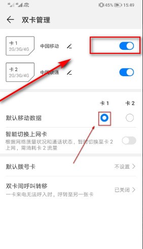 七、如果仅想要使用卡2上网,也可以将卡1关掉。也就是将最上方卡1的右侧的按钮向左滑动。