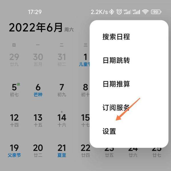 进入日历设置界面打开小米手机日历应用,点击右上角【三个点】图标,在弹出的菜单中选择【设置】。