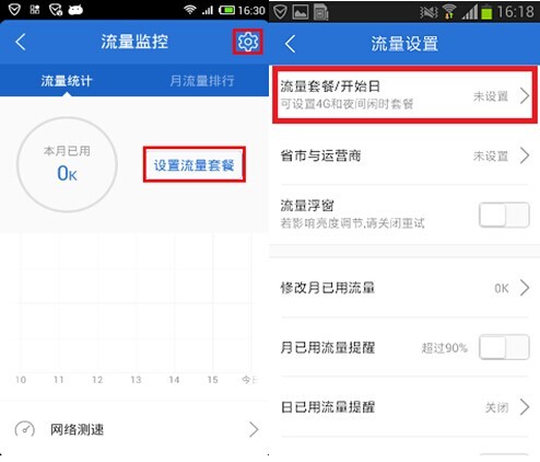 2.进入【流量监控】功能后,通过直接点击【设置流量套餐】或者右上角【设置】 > 【流量套餐/ 开始日】进入流量设置向导界面,通过该页面的每月个人流量套餐限额情况设置,即可使管家对您的流量做出准确监控。图示如下: