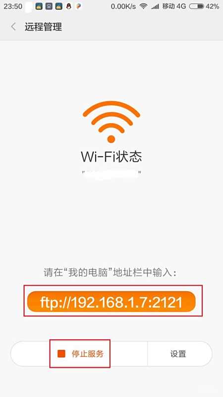 3、在最下面点击“启动服务”,同时也可以看到一个FTP的地址。这个是默认的地址,前面是你手机在局域网内的内网IP,后面是端口,可以自定义。