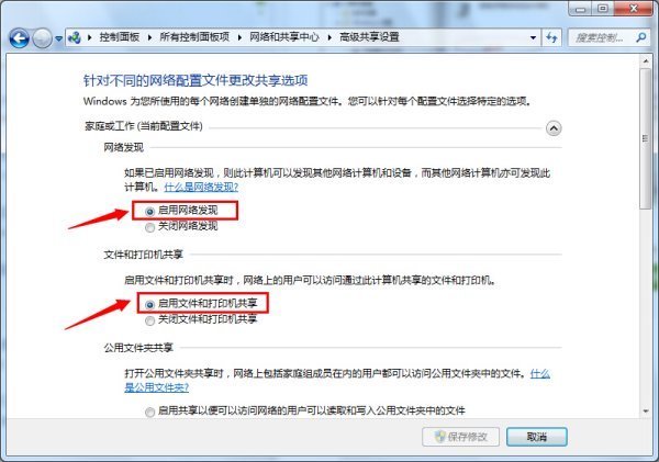 接着打开网络和共享中心,将当前的活动连接网络设置为工作网络,并更改高级共享设置,启用网络发现、启用文件和打印机共享