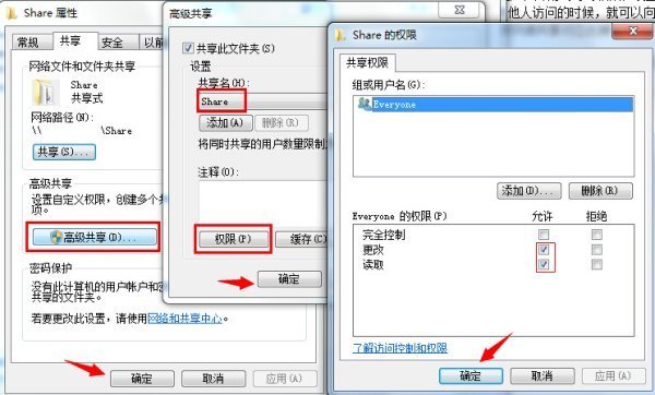 比如,我设置共享一个叫share的目录,同时设置可写,需要给这个目录添加everyone所有人用户,并附与修改权限,设置高级共享,同时设置更改权限,这样其他人访问的时候,就可以向这个共享目录中写入文件了。 如果需要只读共享对应去掉任何一个写入权限即可