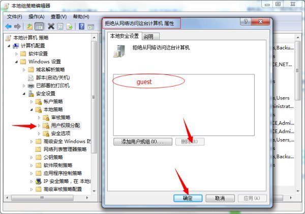运行***.msc,本地计算机策略——计算机配置——Windows设置——安全设置——本地策略——用户权限分配——拒绝从网络上访问计算机,打开后,删除其中包含的guest用户,确定