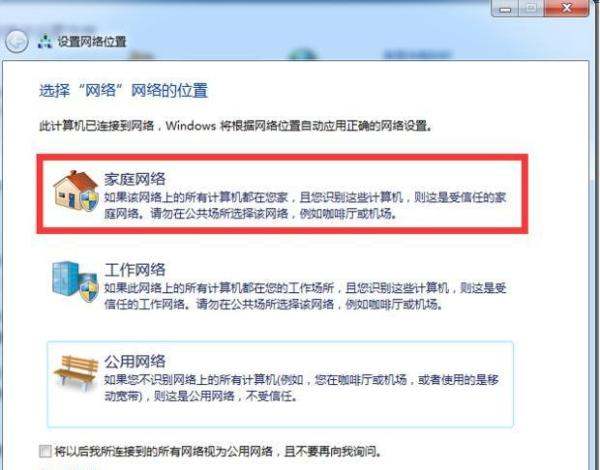 在弹出的窗口中,选择“家庭网络”或“工作网络”,以确保电脑和电视处于同一网络工作组中。