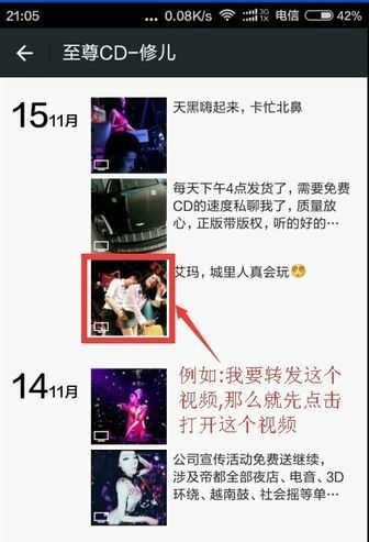 3、打开朋友圈,找到要转发到自己朋友圈的小视频,先转发给自己随便一个朋友,