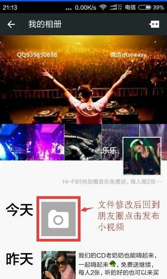 1、打开朋友圈,先随便拍一段小视频,拍完小视频后将其临时保存起来,