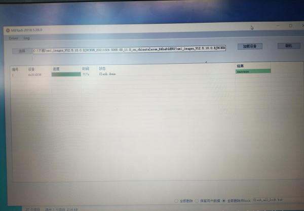 刷机完成后,线刷工具界面会显示绿色进度条,并提示刷机成功。