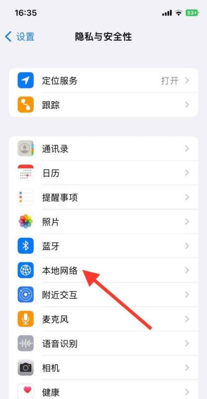 进入“本地网络”设置在隐私与安全性页面中,向下滑动至【本地网络】选项并点击,此功能用于管理App对局域网设备的访问权限。