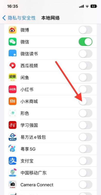 开启小米商城权限在本地网络列表中继续向下滑动,找到【小米商城】App对应的开关按钮,点击右侧滑块至绿色开启状态。此时小米商城即可访问iPhone连接的Wi-Fi局域网内设备(如智能硬件、其他手机等)。
