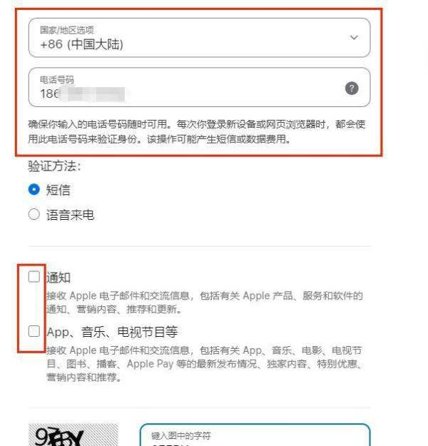 输入手机号码:如果没有香港的手机号码,输入大陆的手机号码也可以,国家和地区代码选择+86。同时取消下面两个广告推送选项,输入验证码后进入下一步。