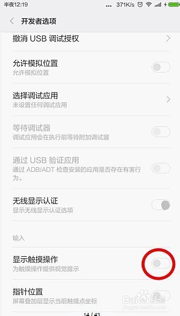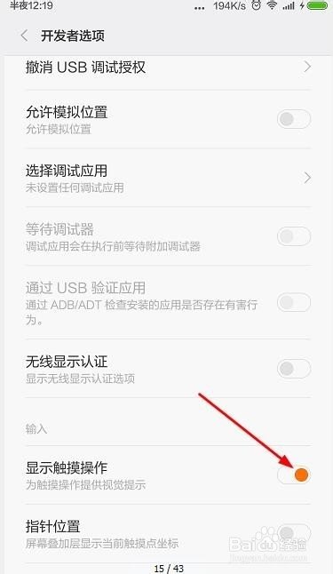 4、点击进入到开发者选项页面,我们可以看到有个输入模块,在输入模块下面有个显示触摸操作,目前是处于关闭的状态;