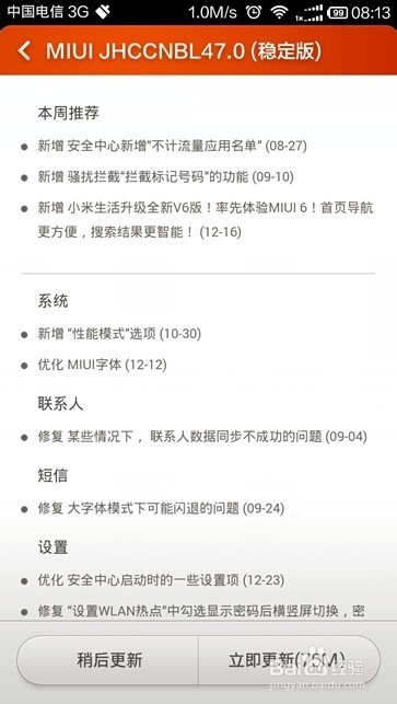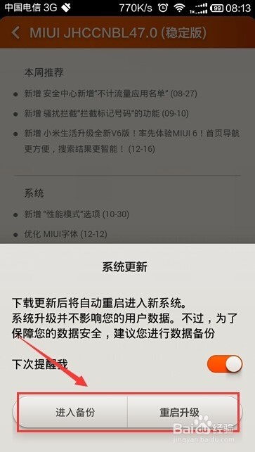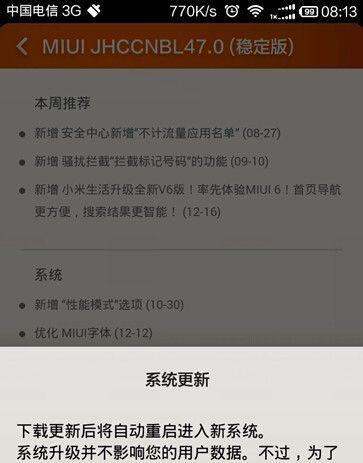 小米红米手机手动升级系统,可按以下步骤操作: