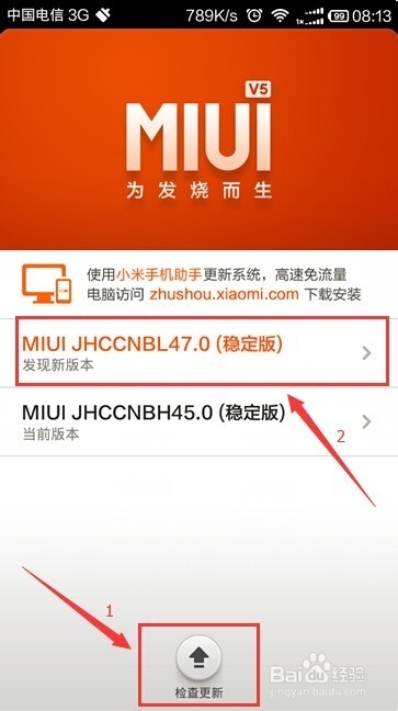 检查更新进入系统更新页面后,若存在可升级版本,页面会显示新版本信息(如箭头2标注位置)。