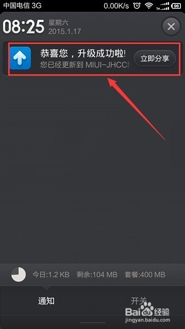 完成升级下载完成后手机自动重启,升级成功后通知栏会显示提示信息。