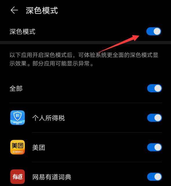 关闭深色模式开关键:在深色模式页面中,会看到右侧有一个开关键,此时开关键是开启状态(显示为蓝色),点击该开关键,将其关闭(显示为灰色)。