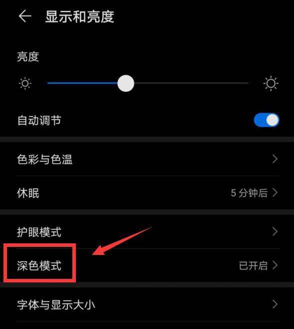 点击深色模式:进入“显示和亮度”页面后,找到“深色模式”选项并点击。