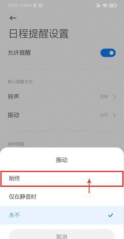 步骤四:开启振动提醒点击【振动】选项,系统默认显示为【从不】,将其切换为【始终】即可完成设置。