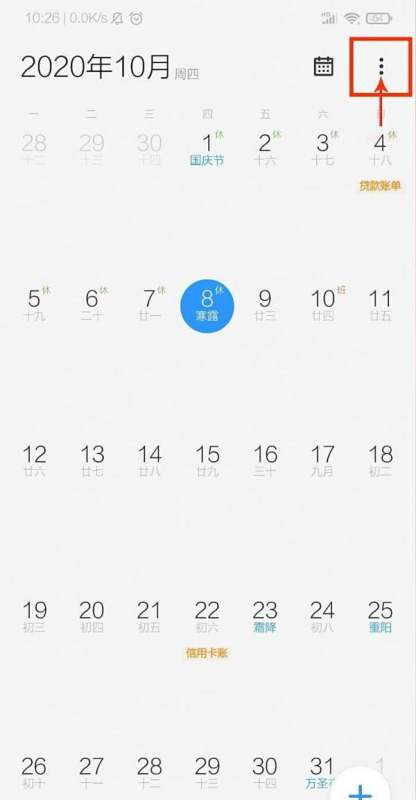 步骤二:进入设置入口点击日历界面右上角的【...】图标,弹出功能菜单后选择【设置】。
