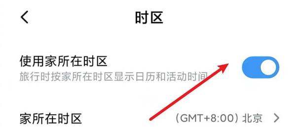 关闭“使用家所在时区”在时区设置中,找到“使用家所在时区”开关,将其从开启状态(蓝色)切换为关闭状态(灰色)。