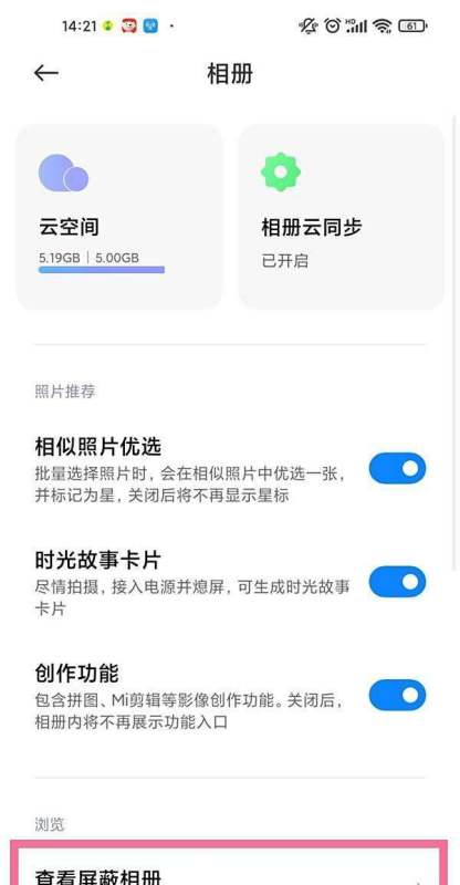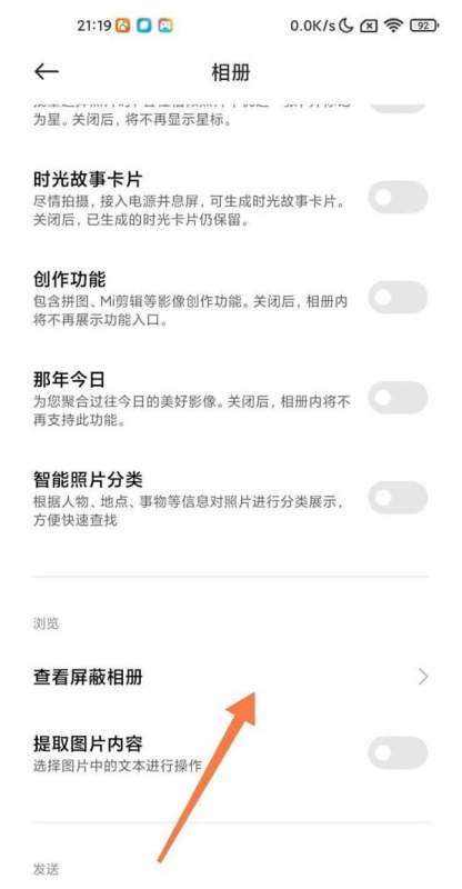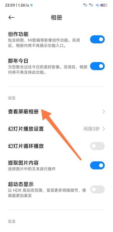 查看屏蔽相册:在设置界面中,直接点击“查看屏蔽相册”选项,系统会自动跳转至被屏蔽的相册列表,用户可在此查看或管理已屏蔽的内容。