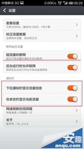 然后出现这个菜单,选择【下拉通知栏显示流量信息】和【在状态栏显示当前流量】即可。