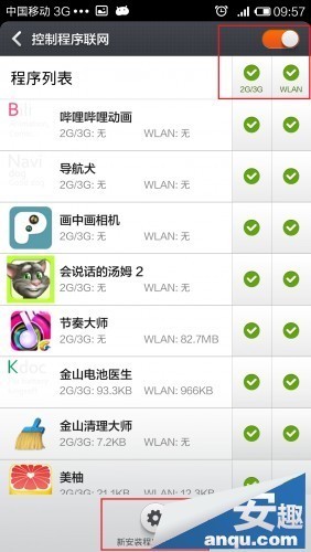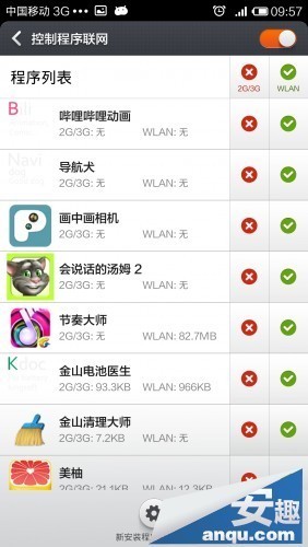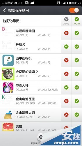 可以批量控制软件可否使用2G/3G网络/wlan网络,哪怕不小心错过软件新安装页面也不怕它偷吃流量了。