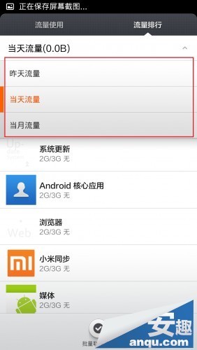 下拉【当天流量】可以看到软件当天/昨天/当月流量统计。这个可以方便大家查看“偷流量”的软件。