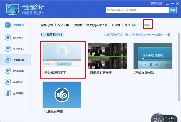 3.点击上网异常界面中的视频选项选择视频看不了选项即可修复。