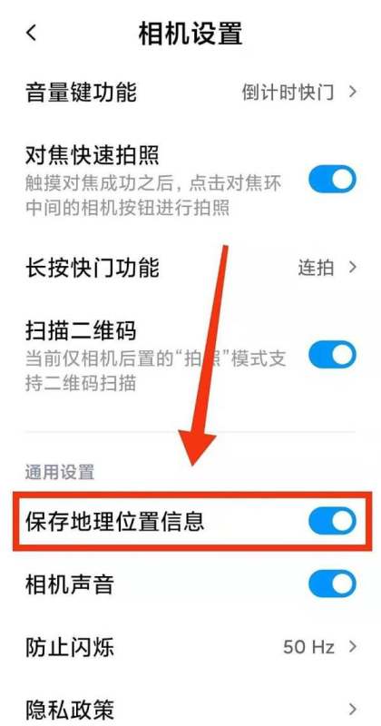 点亮【保存地理位置信息】:在相机的设置界面中,找到“保存地理位置信息”选项,将其点亮(开启)。